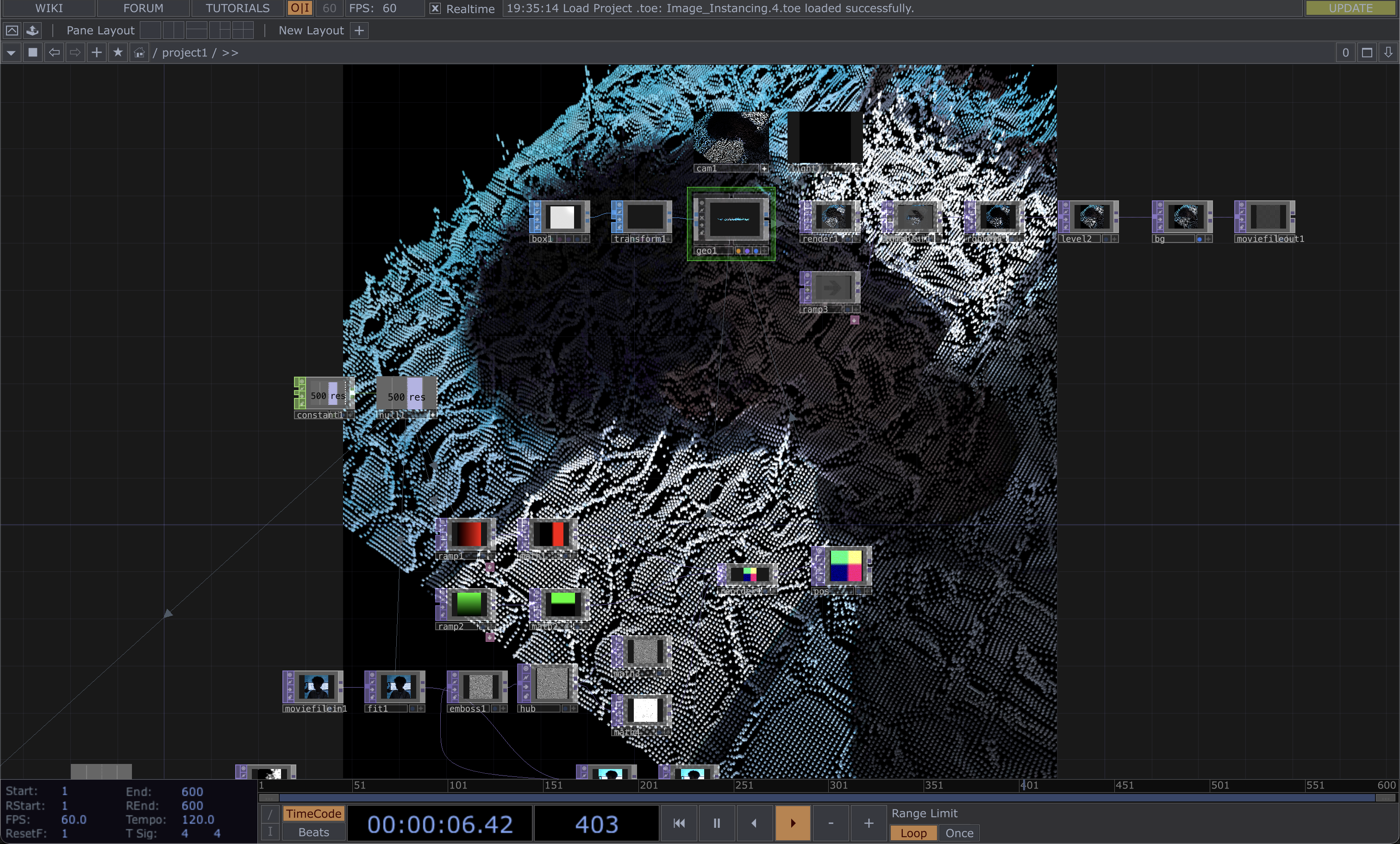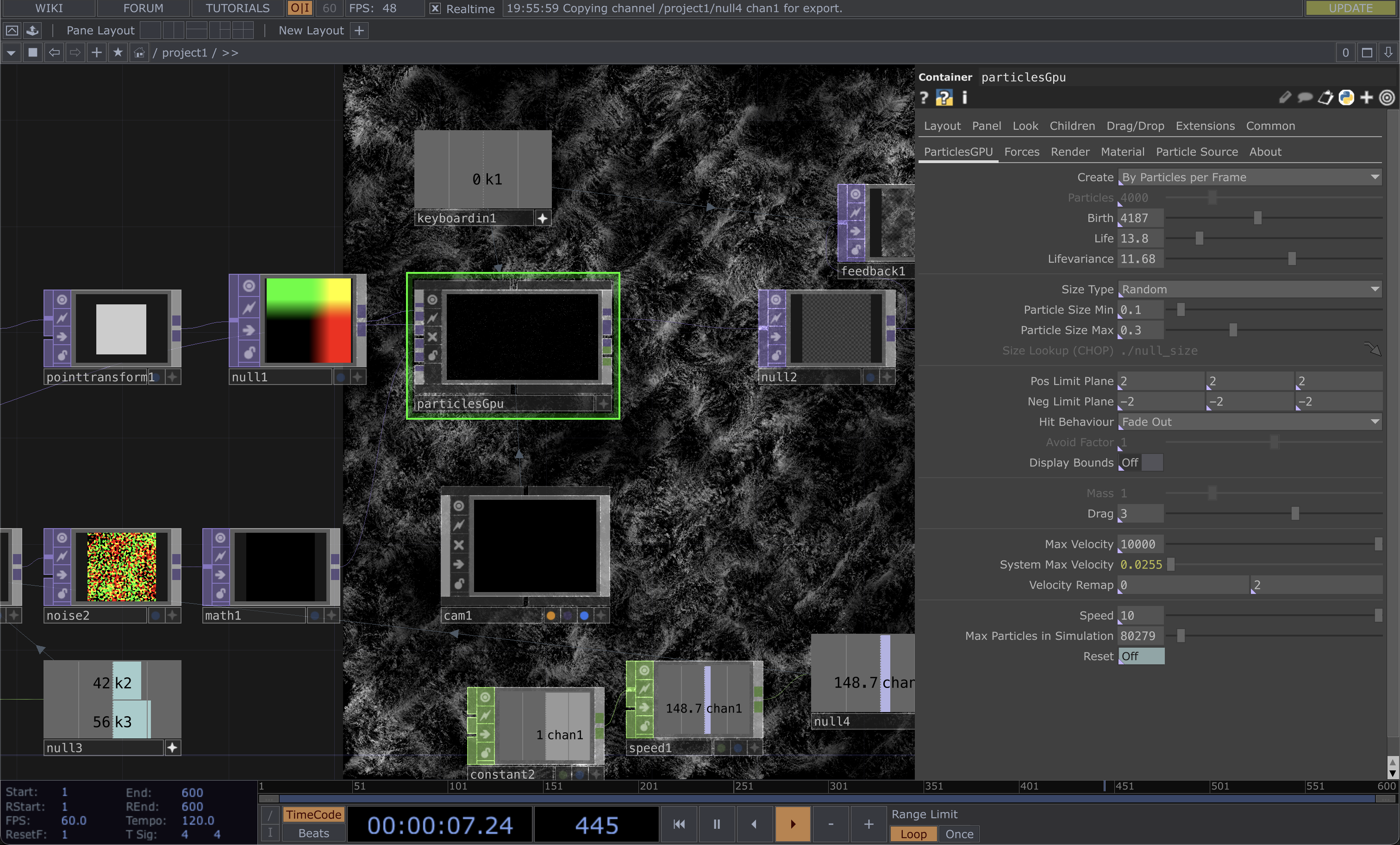 'particlesGpu,' followed by the application of a 'feedback TOP' and movement manipulation through the use