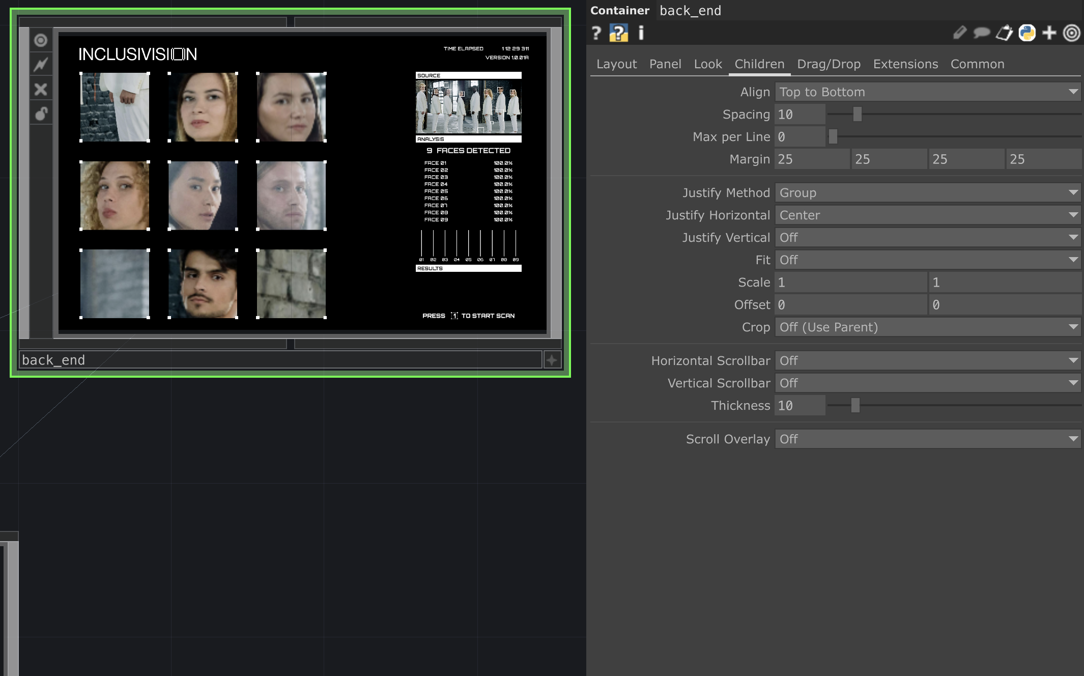 Adjusting the overall size to ensure consistency across the front and back end consumed two full days of work. I carefully adjusted each element and its containers to manually set the resolution size. When an element's size exceeds its container, it's either cropped or scaled automatically, often resulting in disproportionate layouts. While I disdain working with manual numerical adjustments due to the need for individual value readjustments, I recognize the limitations of TouchDesigner in creating responsive layouts.